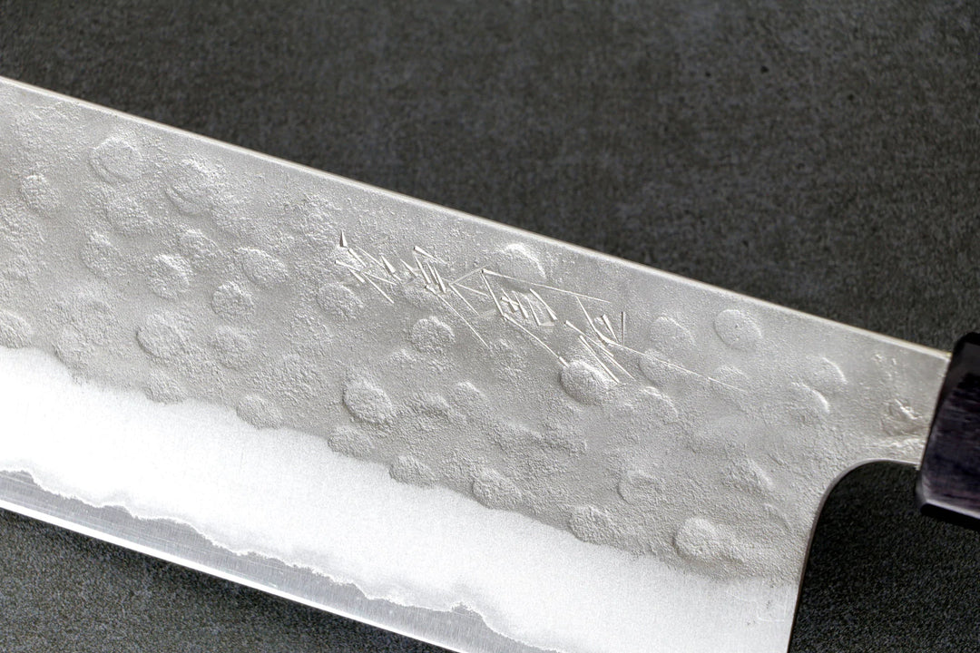 Ce nakiri forgé à la main a une longueur de lame de 165 mm. La caractéristique du type de couteau nakiri est la lame relativement haute. Cette caractéristique fait de ces lames des couteaux à légumes optimaux, même lors de la découpe de gros légumes comme le chou, on constate à quel point ces couteaux sont faciles à manier. Les petits légumes peuvent être aussi bien coupés que hachés, ce qui permet de travailler très finement avec les herbes et l'ail sans écraser les aliments coupés. Après le hachage, ces lames permettent de "pelleter" les légumes de manière optimale dans la casserole ou la poêle. Le centre de gravité de ce couteau de cuisine se trouve vers la pointe de la lame, ce qui réduit l'effort nécessaire pour couper par rapport aux couteaux de cuisine occidentaux dont le centre de gravité se trouve sur le manche. Ce nakiri a une surface spéciale appelée finition Tsuchime. La finition de la lame est très prononcée et rend le couteau si particulier. L'acier de la gaine de cette lame est martelé à l'aide d'une enclume spéciale développée par M. Tanaka, ce qui permet d'obtenir cette structure de surface particulière. Outre l'aspect esthétique, cette surface a également l'avantage de permettre aux aliments coupés de se détacher facilement du couteau grâce aux irrégularités créées. Le noyau de la lame est en acier Blue #2, très résistant à la coupe, d'une dureté d'environ 62 HRC. Une couche d'acier inoxydable plus doux est soudée autour du noyau de la lame selon la méthode San Mai. L'acier inoxydable plus doux sur la lame ne protège pas seulement le noyau interne en acier, mais confère également à la lame une certaine flexibilité. Le couteau de cuisine est forgé par Tanaka-san de la forge Matsubara au Japon.